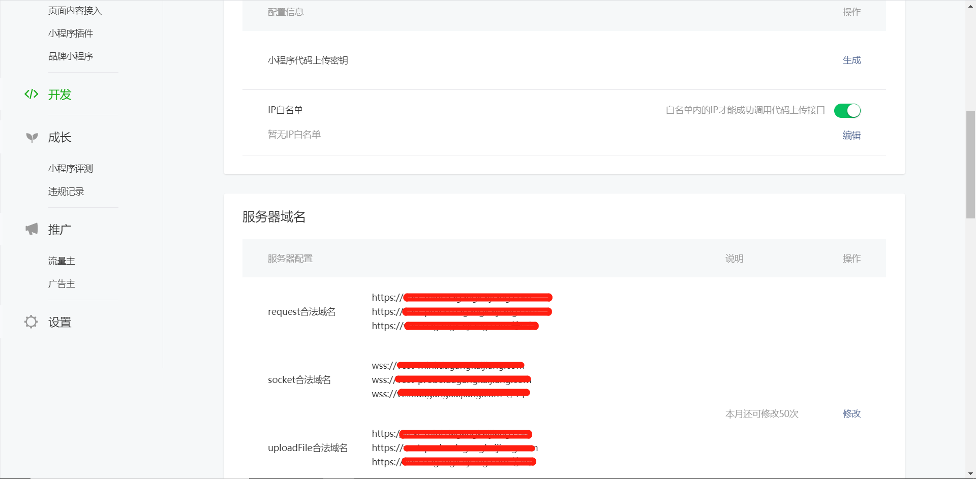 微信小程序支持发起通用请求、文件上传下载、WebSocket通讯机制, 在开发微信小程序的过程中,微信小程序官方强制使用https协议进行网络请求数据传输。小程序请求的域名必须经过微信小程序管理后台通过服务域名设置特定的安全域名(见下图),微信小程序仅能访问已经配置的安全域名下的url,确保网络请求是安全的。